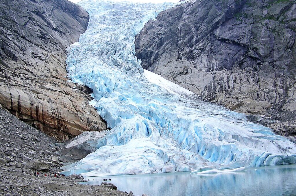 Geleira de Briksdal, Noruega, 2006. Publicado por Vicrogo. Wikipédia. Licença Dedicada ao Domínio Público.