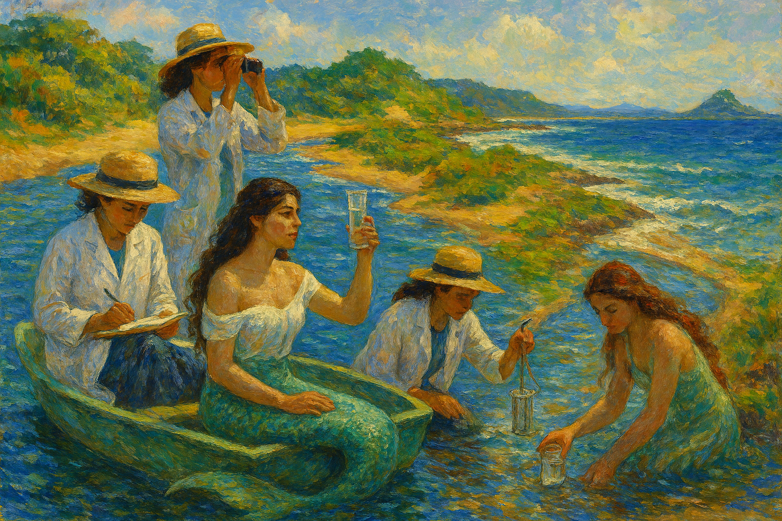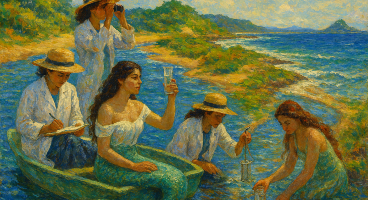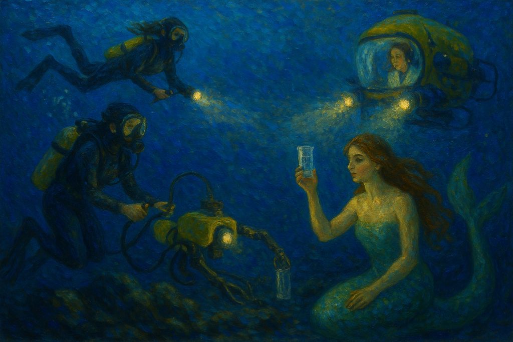 Mulheres Oceânicas no Oceano Profundo, Criado com IA (Mulheres Oceânicas) em estilo impressionista com pesquisadoras e seres encantados da cultura popular. 2025.