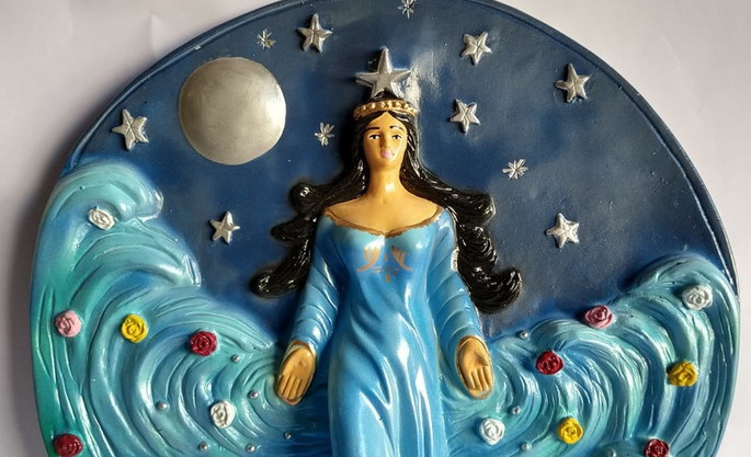 Imagem de capa: Placa redonda de Iemanjá saindo do mar, com ondas e um céu estrelado e com a Lua.