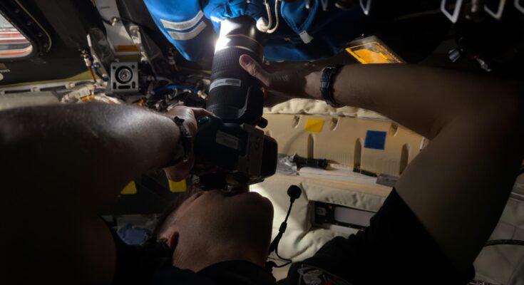 Imagem de capa: Jeremy Hansen captura uma imagem através da cobertura da câmera que protege a janela 2 da espaçonave Orion. A cobertura da câmera, essencialmente uma cortina com um orifício para a passagem da lente, é usada para evitar que a luz da cabine se reflita nos vidros da janela. Crédito da imagem: NASA.