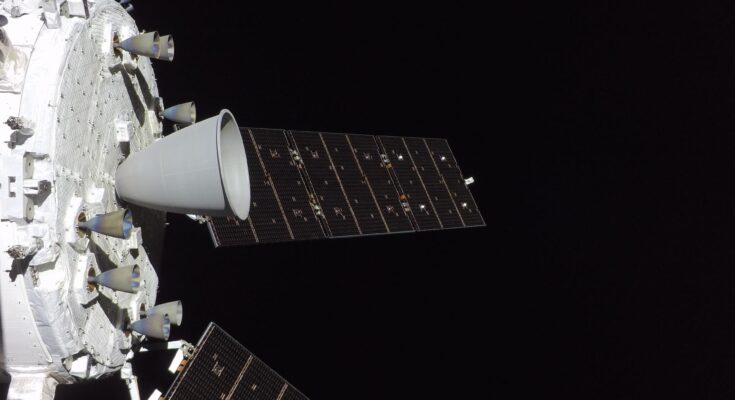 Imagem de capa: Os motores do módulo de serviço da Orion estão em destaque nesta imagem de voo da missão Artemis II. Tirada de uma câmera montada em uma asa de painel solar, o maior é o motor do sistema de manobra orbital, cercado por oito propulsores auxiliares menores. Crédito: NASA.