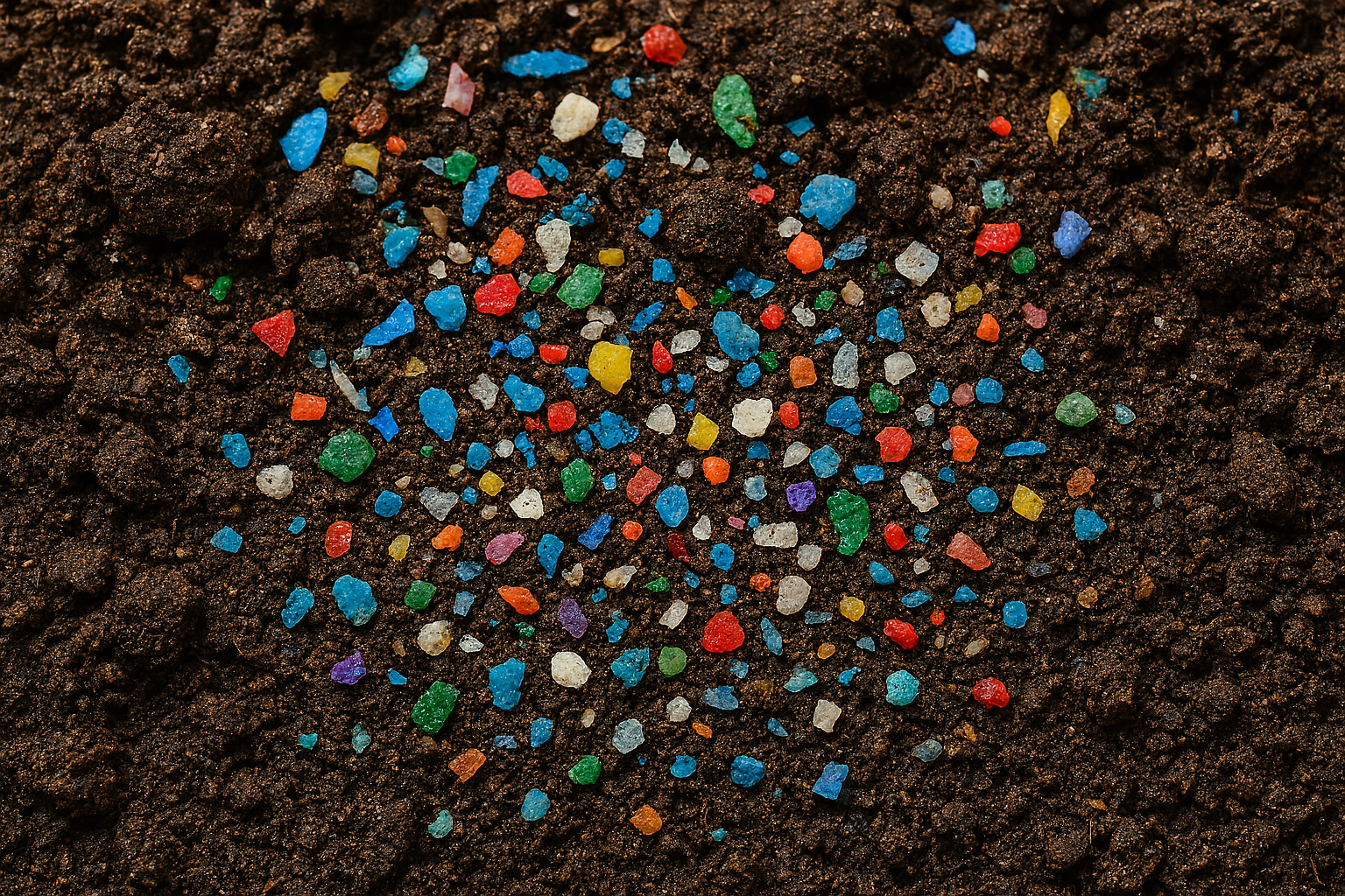 Capa: Microplásticos no solo, composição criada por IA, Microsoft Copilot.