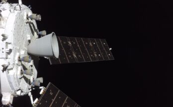Imagem de capa: Os motores do módulo de serviço da Orion estão em destaque nesta imagem de voo da missão Artemis II. Tirada de uma câmera montada em uma asa …